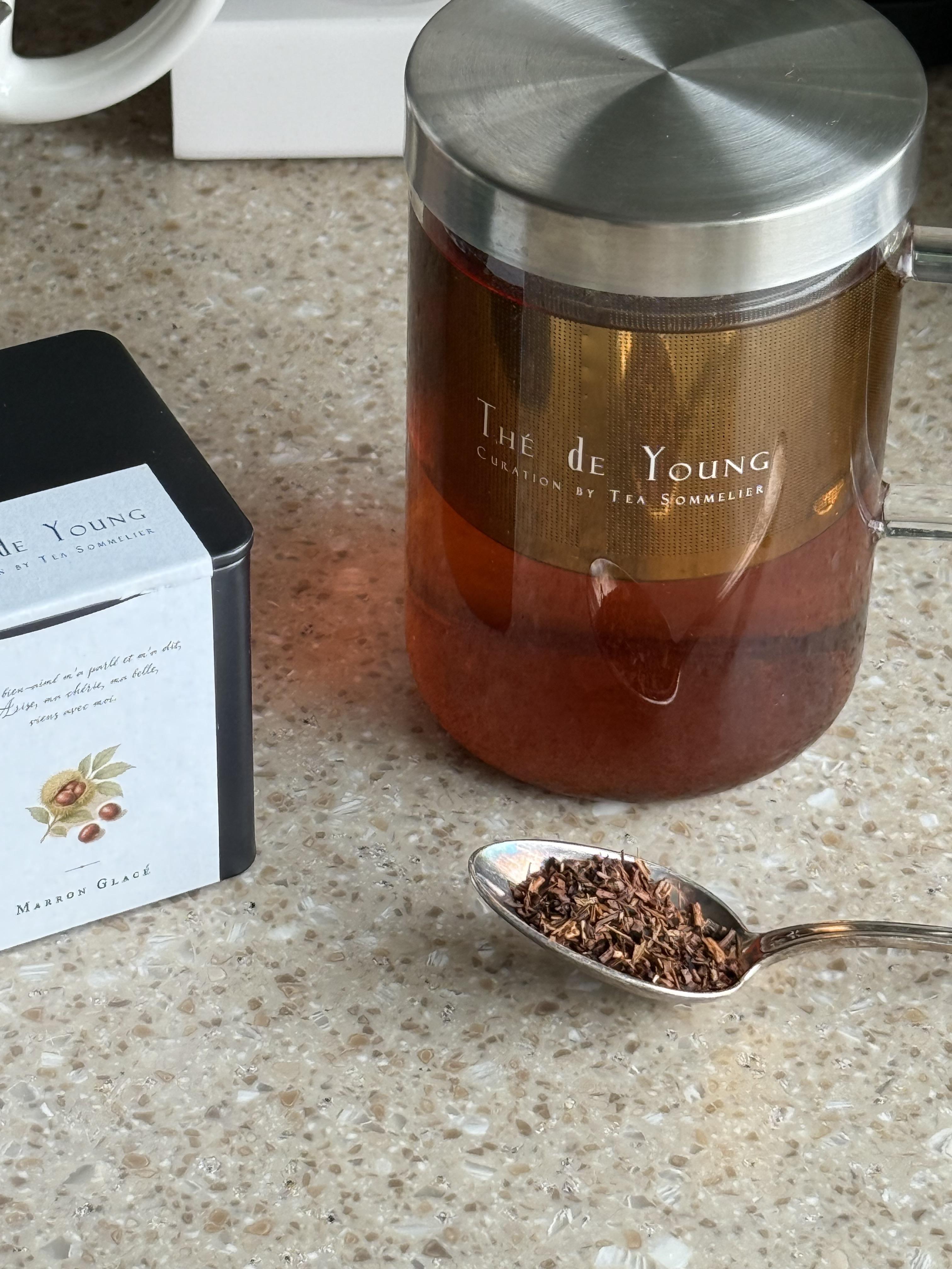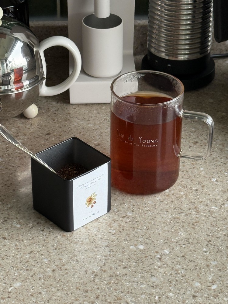 남아프리카의 루이보스와, 허니부쉬를 베이스로 은은한 밤 향과, 꿀 향이 더해진 이 단정한 겨울 맛의 티는 추운 이 계절에 따스하고 부드러운 여운을 더합니다. 향은 달콤하지만 담백한 맛은 물처럼 즐길 수 있을 정도로 단아합니다.달콤한 프렌치 토스트에 말돈소금을 얹어, 단짠의 조합에 콜라보하거나, 케이크나 비스코티같은 달달한 페어링으로 준비하셔도, 마롱글라세의 풍부한 밤향을 충분히 즐기실 수 있어요. 루이보스가 베이스인 마롱글라세는 바닐라빈과 밤향을 더해, 카페인 프리로 즐기실 수 있습니다.