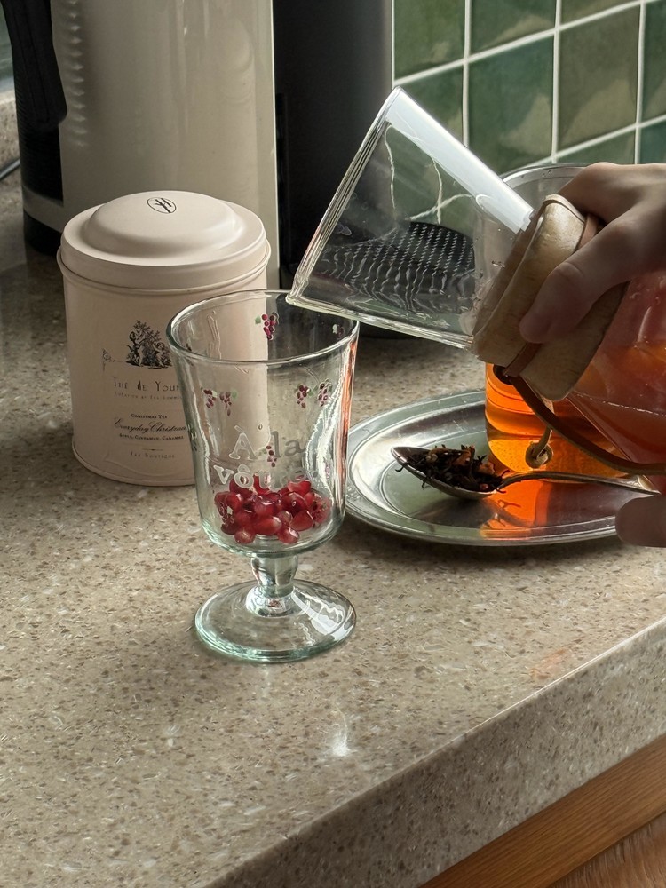 연말 가족 모임에 준비하시면 정말 다들 환호하며 좋아할 거 같아요. 서브할때 석류랑 얇게 슬라이스한 딸기를 넣고 시나몬을 꽂아 서브했더니 정말 멋스럽더라고요.향긋한 딸기와 오렌지 향의 방쇼와 크리스마스티에서 느껴지는 스파이스의 뉘앙스, 마실때마다 토도독 부서지는 석류의 느낌이 어찌나 잘어울리던지, 크리스마스 음료로 서브하시면 정말 좋으실거 같아요.