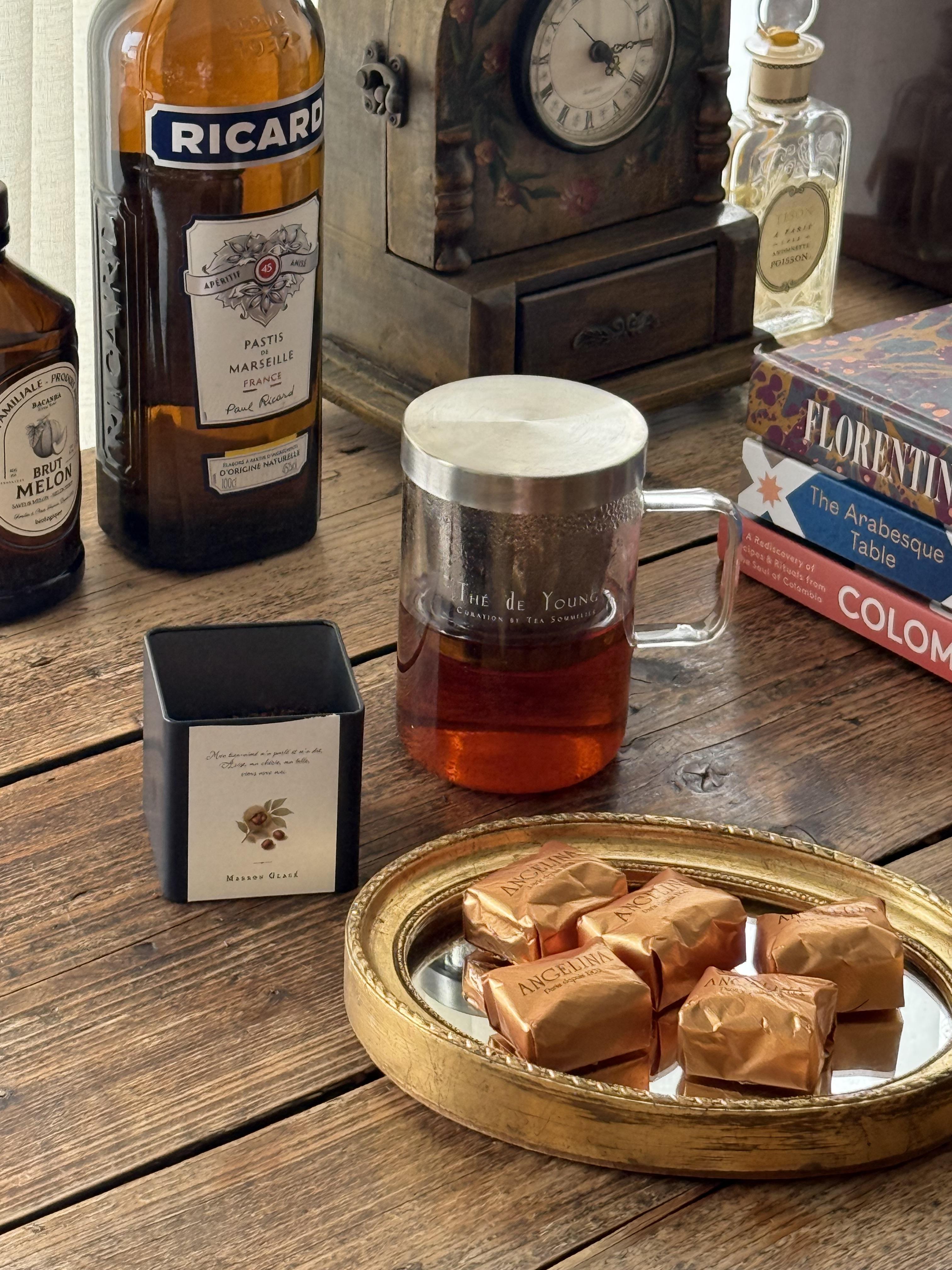 두 번째는 정말 ‘와우‘하는 탄성을 불러내는 티 입니다. 저의 사랑하는 기호품 리스트 중에서, 빼놓을 수 없는 마롱글라세를 표현한 섬세하고 유니크한 티인데요. 마롱 글라세는 밤을 달콤한 바닐라빈 시럽에 천천히 졸여낸, 프렌치 디저트로, 밤의 껍질을 까고, 속살에 깊이 박힌 이물질들을 하나하나 제거하는 매우 까다롭고도, 인내를 요하는 과정을 거쳐 만들어낸 프렌치 디저트의 정점입니다. 졸인밤의 묵직한 달콤함과 고소함, 입안에 부드럽게 퍼지는 풍미, 떼드영의 마롱글라세 티는 이 우아하고 아름다고 풍부한 밤향을 포근하게 품은 카페인 프리의 블렌딩티입니다.